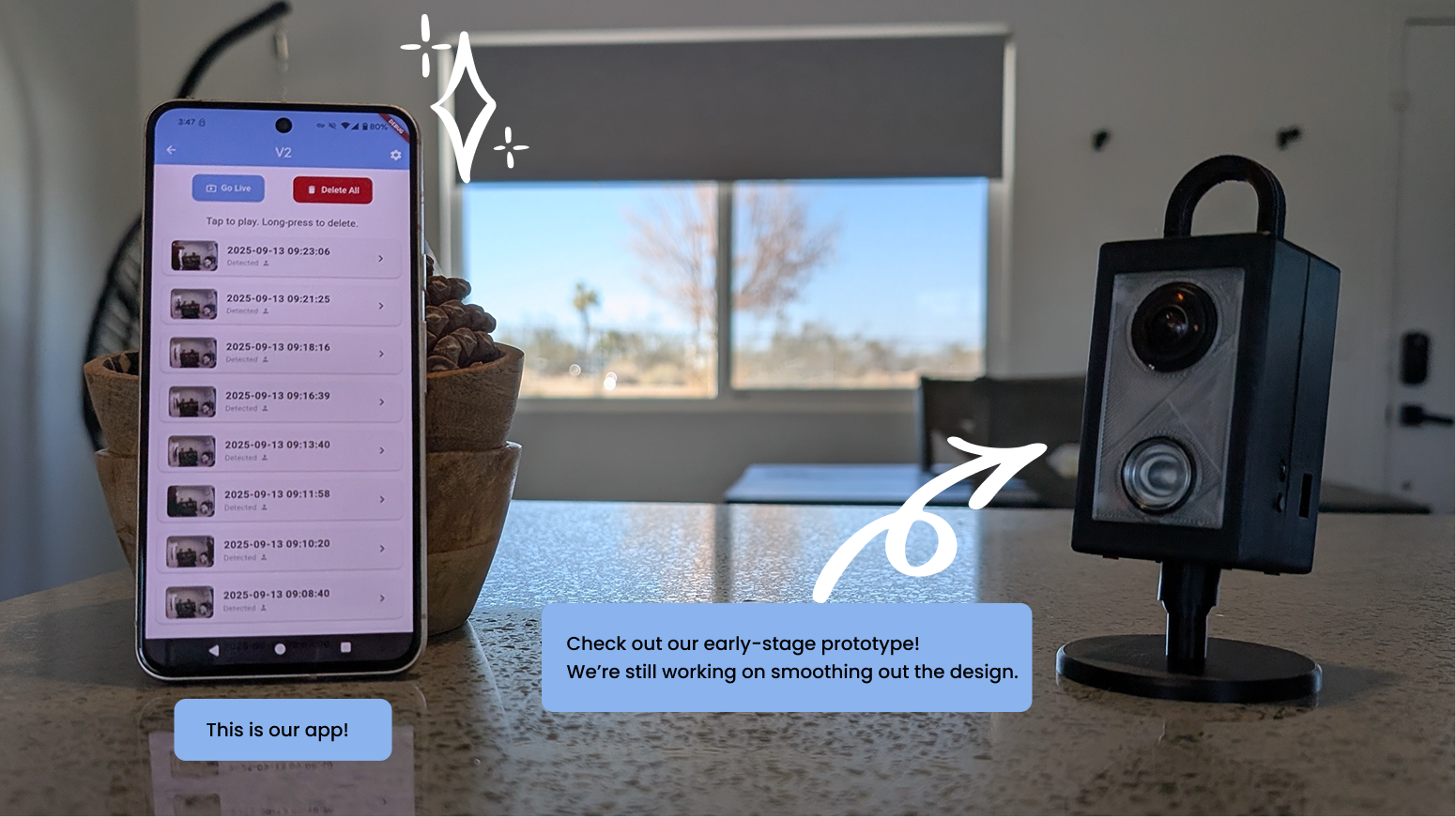 We're also working on a plug-and-play camera prototype that you can see in the image below. However, you're free to bring your own Raspberry Pi or IP cameras to use our software too!